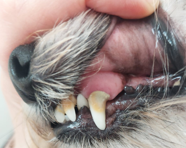 Dentes com formação de inicial de tártaro, que pode resolver com limpeza adequada diária.